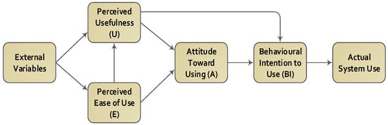 This study uses the technology acceptance model (TAM) [] as its underpinning theory. According to the TAM, user perceptions of usefulness (PU) and ease of use (PEOU) determine the attitudes toward using the system, and attitudes toward using the system determine behavioural intentions, which in turn, lead to actual system use. Perceived usefulness is the degree to which a person believes that using a particular system would enhance his/her job performance, while perceived ease of use is the degree to which a person believes that using a particular system would be free of physical and mental effort []. According to Davis (1989) [], the sequential relationship of belief–attitude–intention–behaviour in TAM, enables us to predict the use of new technologies by users (see Figure 1).