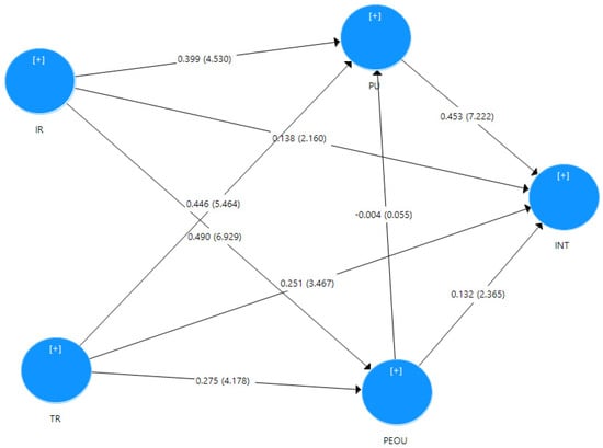 To test the mediation effects of perceived usefulness and trust, PLS-SEM bootstrapping was run as recommended by Preacher and Hayes []. Mediation is said to be established when results of indirect effect from the confidence interval bias corrected is all positive or all negative. If the results show that zero is not between the lower and upper bound, it means that the indirect effect is not zero []. The results of the indirect effects and the confidence interval bias corrected values as shown from Table 6 indicate that perceived ease of use has mediated the influences of interactivity and trust on intention (all p-values < 0.01) which support the hypotheses that perceived ease of use influences the effects of interactivity on intention to use e-training and that perceived ease of use influences the effects of trust on intention to use e-training. Likewise, perceived usefulness has mediated the influences of interactivity on intention and that of trust on intention (all p-values < 0.01) thus supporting the hypotheses that perceived usefulness influences the effects of interactivity on intention and that perceived usefulness influences the effects of trust on intention. However, perceived usefulness has failed to mediate the influence of perceived ease of use on intention (p-value > 0.1). This means that the hypothesis stating that perceived usefulness influences the effects of perceived ease of use on intention to use e-training was not supported.