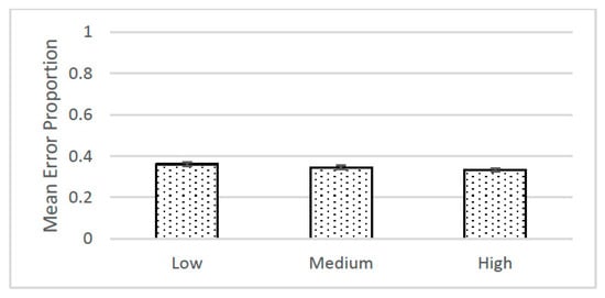 Means and standard errors for proportions of errors committed on the Stroop task for the low, medium, and high contingency conditions.