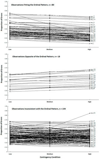 Eschewing NHST, the observed proportions of errors should have instead been examined at the level of the individuals. If the proposed mechanism is set into motion for each participant in the study, then each person’s proportion of errors should follow a simple ordinal pattern across the three contingency conditions; namely, low > medium > high. The proposed mechanism is not detailed enough to make explicit predictions about the exact magnitudes of the errors, but it clearly predicts such an ordinal pattern for each person. The question now becomes, how accurate is this ordinal pattern, which is based on the causal mechanism, when compared to the actual observations?
