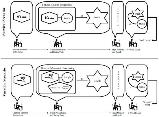 What is the generative mechanism within each student underlying the data and results from these two samples, and what alternative analyses might be conducted on the basis of a diagram of such a mechanism? The top panel of Figure 4 shows an integrated model for a male student who is asked to rate the word “truck” while imagining the survival scenario. As can be seen, the student is tracked through important phases of the experiment, and the structures and processes inferred in his conscious activity are represented as different geometric figures and arrows labeled with different types of causes. More specifically, the figure shows the student first reading the survival scenario instructions and imagining himself surviving on the grasslands. The imaged scene is presented in the elongated hexagon in the model. When presented with the word “truck” and asked if it is relevant to the scenario, the student is required to work simultaneously with two mental activities: (1) the imagined scenario, and (2) the predication of the word “truck” (represented as a circle in the model). Nairne et al. state clearly that the proximate mechanism of fitness-related processing is not known; hence, the model simply shows the two mental activities as interconnected and encapsulated by a rectangle labeled as “fitness-related processing”. The function of this processing is to enable the coding of the word “truck” into the memory store. This causal relation is shown as the arrow labeled “Ef” in the figure to denote it as an efficient cause, in distinction from a material, formal, or final cause (see [,,]). The encoding process is represented by the hexagram. The student in the model is then shown completing the filler numerical recall task, and finally retrieving “truck” from the memory store and typing it as a response. The arrow labeled “Fi” indicates a final cause, as the student retrieves the word from memory for the purpose of fulfilling the experimenter’s request. The prediction from the model is clear: each student presented with “truck” in the survival scenario should recall the word at the end of the study. The same can be said for all the rated words in this scenario because the model is tantamount to a logical “if … then” statement. Simply put, if the word is subjected to survival processing, then it will be recalled.