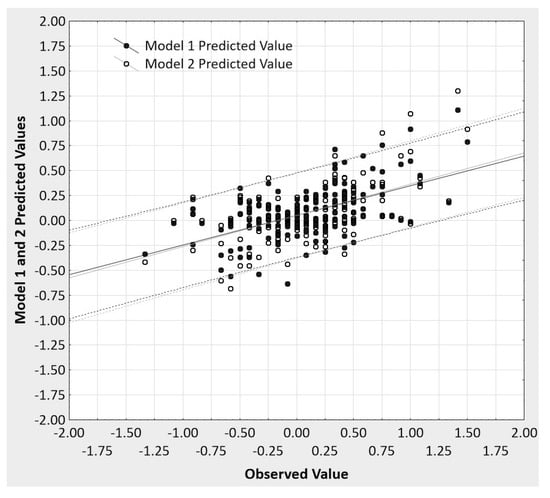 Toward that end, Figure 6 presents the observed values plotted against the predicted values for each model, the two regression lines, and the 95% prediction intervals around each regression line for the data from Vianello’s [] replication study. A serious attempt at establishing predictive accuracy of any regression uses prediction, not confidence intervals, or it bootstraps the appropriate prediction intervals from V-fold or some other form of cross-validation of regression results. The prediction interval gives information on individual predictions of the dependent variable, while a confidence interval is about estimating a likely mean (aggregate) prediction. That is, a prediction interval for a predicted value of the dependent variable gives us a range of values around which an additional observation of the dependent variable can be expected to be located with a given level of certainty. In contrast, the confidence interval provides the estimated range of values within which a certain percentage of all confidence intervals computed from independent samples from the same population will include the unknown population parameter (the mean predicted value). As can be seen in Figure 6, the two models’ predicted values are barely discriminable from one another, likewise the regression lines and prediction intervals. Moreover, the prediction intervals are so wide as to suggest that making any strong claims based upon these data is unwise.