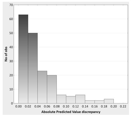 The histogram of absolute value discrepancies between Model 1 and Model 2 predicted observations.