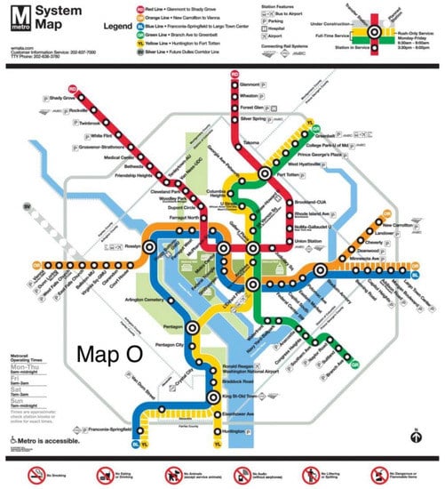 This research follows a similar approach as Guo et al. []. Using Guo’s existing alternative maps and O-D pairs, it conducts the experiment on two distinct participant groups: those frequent riders who are very familiar with the Washington DC subway, and those infrequent riders who are less familiar with the system. With the results showing frequent riders to be more sensitive to changes on alternative maps, this work legitimizes map design as a powerful tool to shift passenger behavior and alleviate transit systems’ capacity constraints.