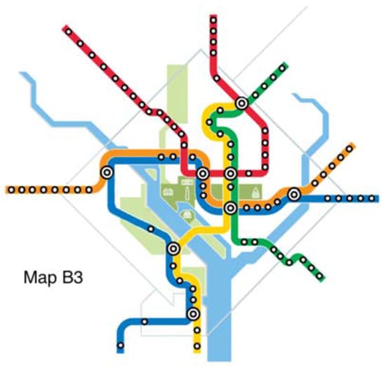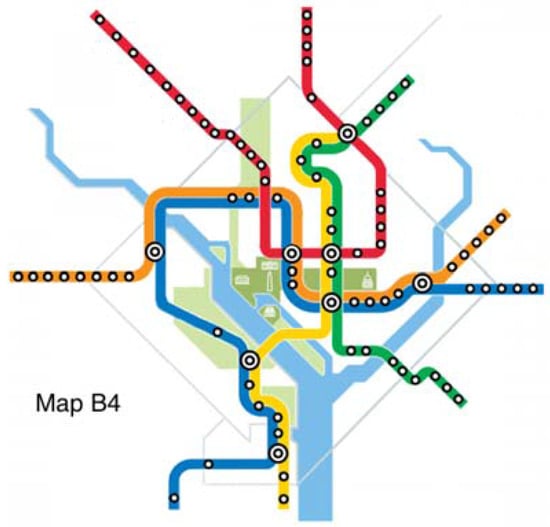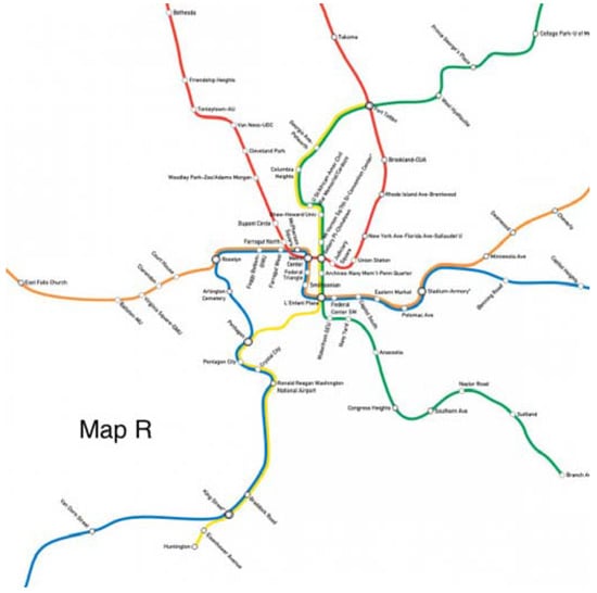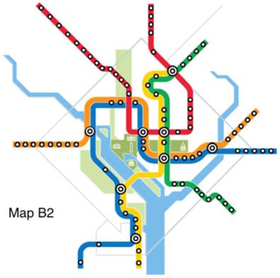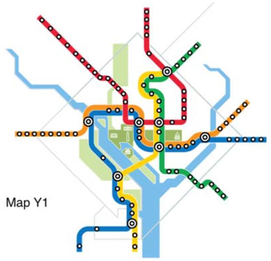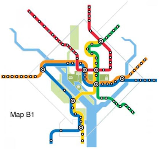 The original map and six alternative maps are used in this work (Figure 2, Figure 3, Figure 4, Figure 5, Figure 6, Figure 7 and Figure 8). Map O and R are acquired from Internet open sources, while Map B1–B4 and Y1 follow designs developed in Guo et al. [] with permission from Guo. Map O is the original schematic map, as shown above and as would have been shown at metro stations in DC. Maps B1 through B4 extend the Blue Line in different directions and lengths. Map Y1 shortens the Yellow Line by streamlining it. Map R is the true map without any distortions. Changes made to create each map are detailed in Table 1 and the alternative maps are shown below in Figure 3, Figure 4, Figure 5, Figure 6, Figure 7 and Figure 8. The Y/B ratio is the ratio of distances between Pentagon and L’Enfant Plaza on the Yellow Line and Blue Line, with unit distance defined as the length of the Yellow Line between the aforementioned stations in the original map, Map O.