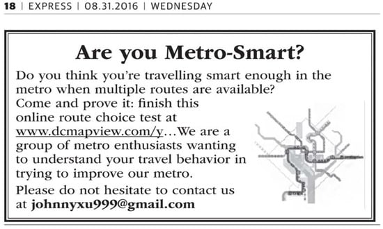 Between late 2016 and March 2017, the author designed and posted advertisements titled “Are you Metro Smart?” (Figure 9) for five weeks on The Express to solicit survey responses. The Express is a DC-based, free daily newspaper available at WMATA metro stations, largely targeting daily commuters and usually running out by 9AM. Readers of this free newspaper are primarily frequent riders of the system.