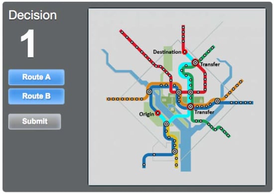 One of the most sophisticated works to date was done by Guo et al. [] using Amazon Mechanical Turk. Guo asked 2655 participants to choose their routes between eight Origin-Destination pairs on one of seven maps of the DC subway. Although answering key questions on general passenger behavior, Guo collected results from an overwhelmingly novice participant base (given Mechanical Turk’s general representativeness of the population) and thus did not focus on differences in behavior between frequent and infrequent riders when shown alternative designs.