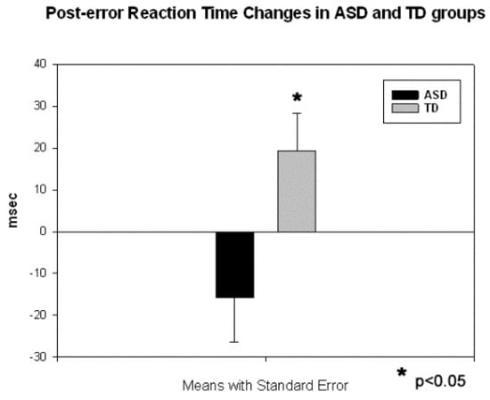 Post-error reaction time (RT) changes (calculated as a difference between the first post-error RT minus mean preceding RT) in ASD and TD children. Typical children show normative post-error RT slowing, conversely ASD children respond faster after having committed an error.