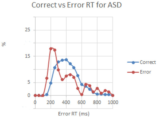 Distribution of RT in correct and error trials in children with ASD. Error trials had higher percentage in the faster bins of the histogram with moda around 200 ms vs. 400 ms in correct trials.