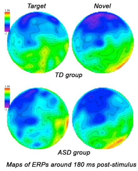 Grandaverage qEEG map of ERP to target and novel stimuli around 180 ms post-stimulus in ASD and TD children. Children with ASD showed comparable high negativity (N1 ERP component) to both targets and novels.