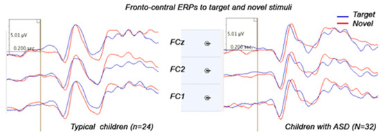 Screenshot of fronto-central ERPs to target and novel stimuli in ASD and TD children. The ASD children showed more negative N1, prolonger N2a and augmented P3a in response to unattended novel distracters.