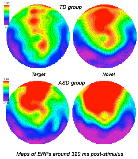 Grandaverage qEEG map of ERP to target and novel stimuli around 320 ms post-stimulus in ASD and TD children. Children with ASD showed higher positivity (P3a ERP component) to both targets and novels at the frontal and froto-central topographies.