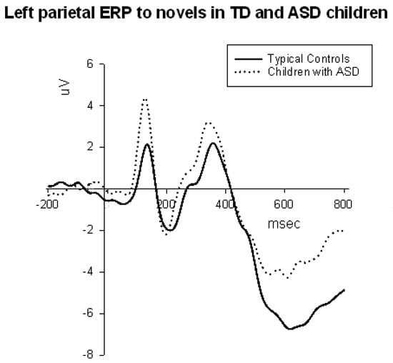 Left parietal ERPs to novels in ASD and TD children. The ASD group showed higher amplitude of P1 and P3b ERP components in response to novel distracters.