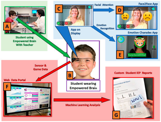 (A) Student with Autism Spectrum Disorder (ASD) wears Empowered Brain as he interacts with educator during a 10-min intervention in a typical classroom setting. (B) Student looking at display screen of Empowered Brain. (C) Screenshot of one of the Empowered Brain apps as would be seen on the optical display of smartglasses. (D) Example of the Face2Face app, a game-like experience designed to improve facial attention and mutual eye gaze. (E) Example screenshot of Emotion Charades app, a game-like experience that improves emotional understanding through the use of emotional artificial intelligence. (F) Example of metrics and qualitative session and student data captured and analyzed by data portal. (G) Generation of customized reports for student Individualized Education Programs (IEP) demonstrating learning and skill development.