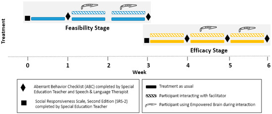 The efficacy stage of the study followed positive feasibility findings from the first stage. This stage lasted three weeks and involved a one-week control period, a one-week intervention period, and an additional intervention extension period. During the control week, twice-daily 10-min socio-emotional focused conversations were facilitated by the educators without the use of the Empowered Brain system. This was followed by an intervention week where these twice-daily conversations were repeated but with the addition of the Empowered Brain system. Following the intervention week, a one-week intervention extension period was also undertaken to further explore the longer-term effects of the smartglasses augmented intervention.