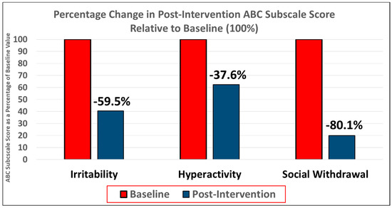 Results of the feasibility stage. Improvement in symptoms of irritability, hyperactivity, and social withdrawal as determined by percentage reduction in ABC subscale scores post-intervention relative to baseline. Irritability was improved by 59.5%, hyperactivity by 37.6%, and social withdrawal by 80.1%.