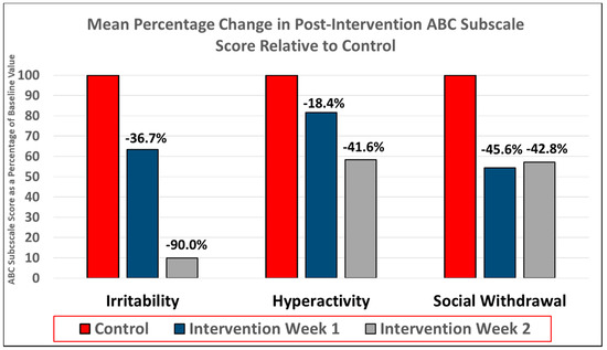 Results of the controlled efficacy stage. Improvement in symptoms of irritability, hyperactivity, and social withdrawal as determined by percentage reduction in ABC subscale scores post-intervention relative to baseline. Irritability, hyperactivity, and social withdrawal were improved at both intervention time points relative to control period.
