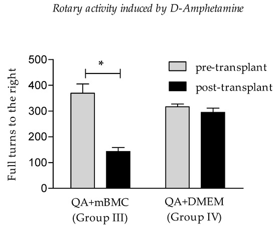 Rotatory activity induced under D-amphetamine. Lesioned group with quinolinic acid + mononuclear bone marrow cell transplant (QA+mBMC, Group III) and lesioned group with QA+Dulbecco’s modified Eagle’s medium (DMEM) transplant (QA+DMEM, Group IV). Abscissa, number of complete right turns ipsilateral to the lesioned hemisphere. Data are expressed as mean ± standard error of mean (SEM). Ordinates: experimental groups (* equivalent p ≤ 0.04).