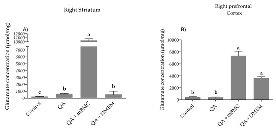 Study of glutamate (GLU) concentration in lesioned rats with transplanted mBMC. (A) Comparison of GLU concentration in the right striatum among the experimental groups: H (3, 20) = 16.28, p < 0.001. (B) GLU concentration in right prefrontal cortex among the experimental groups: H (3, 19) = 15.53, p < 0.001. Data are expressed as mean ± SEM. The letters in the top the bar correspond to statistical differences among the experimental groups. The data analysis was carried out through one-way non parametric ANOVA, using the Kruskall–Wallis test (common letters: non-significant differences; different letters; significant differences).QA lesion (Group II); lesioned group with QA + transplant (QA+mBMC, Group III); and lesioned group with QA+DMEM transplant (QA+DMEM, Group IV).