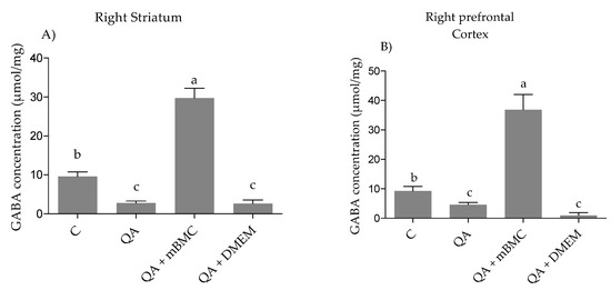 Although reports of the activity of GABA and glutamate are described in experimental models [26], there is no information available on the changes in the concentration of these amino acids in the experimental model of Huntington’s disease induced by quinolinic acid and the effectiveness of mBMC transplantation.
