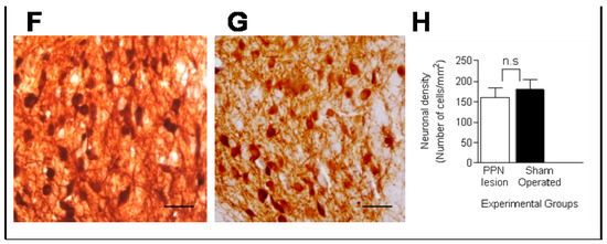 - Gonzalez-Hernandez, T.; Abdala, P.; Rodríguez, M. NOS Expression in Nigral Cells after Excitotoxic and Non-excitotoxic Lesion of the Pedunculopontine Tegmental Nucleus. Eur. J. Neurosci. 1997, 9, 2658–2667. [Google Scholar] [CrossRef] [PubMed]