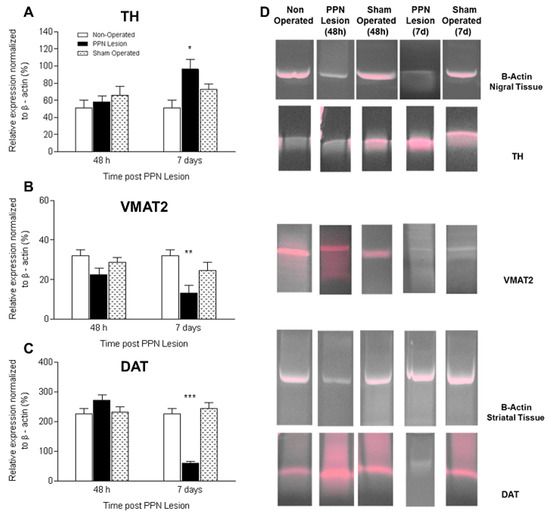 | Experimental design | In order to study the early effect of the PPN neurotoxic lesion on the gene expression of TH, VMAT2 and DAT, the mRNA expression of the above-mentioned proteins was evaluated 48 h and 7 days after injury. The following experimental groups were organized: Healthy rats (non-operated) (n = 12), rats-PPN injury (48 h post lesion) (n = 13), rats-PPN injury (7 days post lesion) (n = 12), rats Sham operated (48 h after surgery) (n = 13), rats Sham operated (7 days after surgery) (n = 12). Rats were lesioned, assigned randomly to the experimental groups and sacrificed in the temporal window already described |
