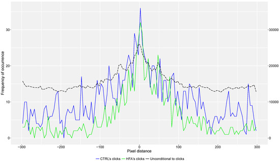 In Figure 3 three frequency distributions are shown, corresponding to distances between avatars’ positions and to distances conditional to the presence of CTRL and HFA clicks. A Kolmogorov-Smirnov test indicated that the two sets of distances are drawn from a different distribution (D = 0.132, p < 0.0001). Overall, the CTRL group has more clicks. The crossings between participants correspond with the values around 0; the crossing of controls with the lure of the participants with HFA corresponds with the values around −50, whereas the opposite situation corresponds with values around +50. Caution is advised when interpreting the plot for the two different populations, as this spatial representation does not take into account participants’ click reaction times. As such, participants clicking faster will have a higher frequency of small distances. Conversely, slower participants will have a correct click represented as a larger distance.