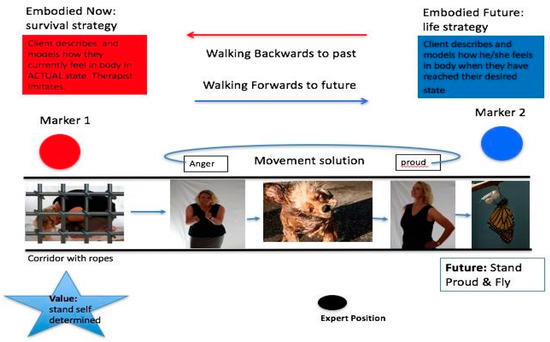 After establishing the relevant value as a resource, the therapist encourages the client to enter the passageway of the corridor (Figure 1, Step 11 and for more detail Figure 3 below). Next a defining path is set which has a start point (How body feels in actual state) and end point (How body feels when the client has reached their desired state). An image and motto is picked for the end state and the client shows a body posture or movement that is matching to the image. The therapist imitates the client’s embodied future. In the values corridor, a defining path of change is established. The client moves forwards through each emotion identified from the Emotional Field which is positioned along the corridor in a definable space with ropes and markers towards a movement solution. Here the therapist can change in following and taking the lead. The therapist usually plays a more active role in the corridor, acting as a synchronizer and guide. The therapist encourages the client along the corridor to embody each emotion and then to feel for a movement solution that will help the client get to their embodied future, picking up hints of the client’s nonverbal displays. In emotional mastery of our model, synchronization of the therapist’s movements with those of the client during a guided interaction in the values corridor is hypothesized to lead to prosocial consequences such as greater rapport, feelings of closeness between the client and the therapist [128,129].