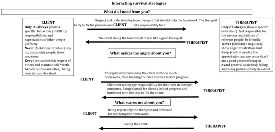 A 38-year-old accountant comes for treatment suffering from exhaustion and depressive moods. She is fighting to keep not only her job but basically to keep the entire company going, because the company has moved into the red. After a colleague and her direct boss went on sick leave, she has been running the entire business practically alone. She does overtime daily because in general she feels responsible for everything and even on weekends cannot leave her work behind. She is suffering from lack of sleep and an inability to concentrate. In addition, she has been suffering from stomach and neck pain for many months. Often, she feels beaten down, sad and helpless, because no one supports her. She comes to the session not having completed her set homework from the session before and then angrily blames the therapist because she is not getting any better. A therapist unaware of their own and the client’s emotional survival strategy is likely to have a problematic outcome in this scenario as shown in Figure 4 and Figure 5 below.