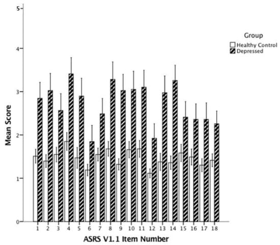 Mean scores for the 18 ASRS-v1.1 items in healthy control and depressed patients. ASRS-v1.1: Adult ADHD Self-Report Scale Symptom Checklist. Note: To quantify responses, we assigned a numerical score to each of the five response options: “never” = 1; “rarely” = 2; “sometimes” = 3; “often” = 4; “very often” = 5. All p < 0.005. Error bars: 95% CI.