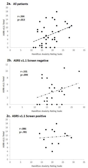 Fourteen of the 40 MDD patients screened positive on the ASRS-v1.1 Part A, with a score ≥4. As shown in Table 3, the screen positive patients had significantly higher anxiety (HAMA) scores. They also scored significantly higher on HAMA item 5 (Concentration impairment) and on the RRS. Among all 40 MDD patients, the number of ASRS-v1.1 items endorsed at the threshold level was positively correlated with anxiety (HAMA score), both for Part A (r = 0.336, p = 0.036) and for all 18 ASRS-v1.1 items (r = 0.394, p = 0.013) (Figure 2a). The correlation with anxiety was stronger for ASRS-v1.1 screen negative MDD patients (Figure 2b) than for screen positive patients (Figure 2c), though the association was not significant for either group.