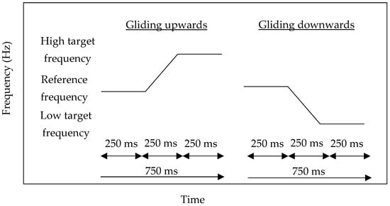 In each condition, as gliding frequencies have a higher detection rate of frequency change than discrete frequencies [], the two pure-tone frequencies were arranged to glide upwards or downwards, smoothly and randomly in 750 ms, instead of being separated by a silent interval. Within 750 ms, the first 250 ms was the reference frequency, the second 250 ms was the gliding effect, and the last 250 ms was the target frequency. An unlimited pause of the inter-stimulus interval was given in each trial for responding. The schematic representation of the stimuli is shown in Figure 1.