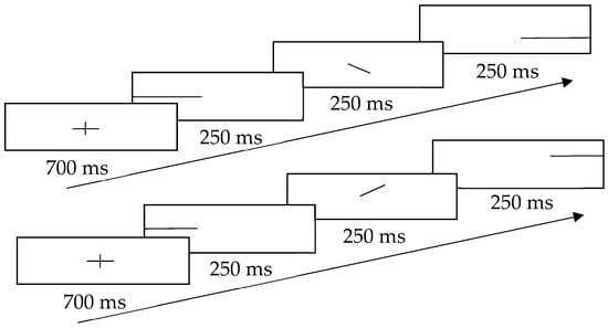 The design of visual cues was adapted from the study by Ben-Artzi and Marks (1995), which revealed a positive relationship between the pitch change and the position of the dot []. To minimize the efforts of the searching dots, this study adopted a continuous straight line as the visual cue. This line showed the gliding direction when a participant listened to the sound track and identified the change of the frequency. The schematic representation of visual cues is shown in Figure 2. To prevent participants from noticing the answers directly from the cues, both congruent and incongruent cues were presented to them. For the congruent cue, the line went up or down in the middle of the screen, according to the gliding direction in the sound track; for the incongruent cue, the line went in the opposite direction to the gliding direction in the sound track. To prevent habituation and to indicate the start of the next trial, a fixation cross (+) was flashed at the beginning of each trial.