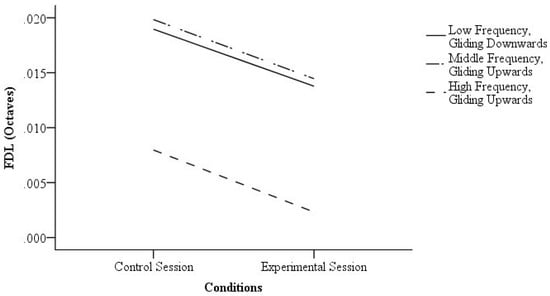 However, there was no significant difference between the control session and the experimental session in the conditions of “low frequency, gliding upwards”, “middle frequency, gliding downwards”, and “high frequency, gliding downwards”. As the FDL applied in this study was continuously being reduced to a level smaller than 120 cents, the findings suggest that in some conditions, the FDLs beyond this optimal range are not susceptible to modifications.