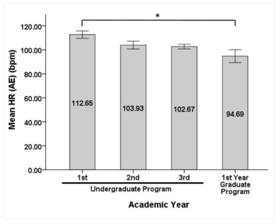 Bar graph showing mean HR (bpm) among students in different academic years after examination (error bars ± SEM); * represent significant difference between first- and fourth-year students with P-value ≤ 0.05.