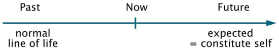 VR visualization of a line of life can help someone understand the challenges in their self-narrative. A healthy perception of one’s life narrative helps someone to constitute a future self (Figure 1). In the case of a broken narrative (e.g., the loss of some ability due to a traumatic event), the self-image projected into the future is not as clear or robust as that of a healthy person [,,]. VR offers a new perspective [], and so, during immersion, one’s life vision can change. A vision of the future serves as a constitution of the self and a reassurance of one’s life story.