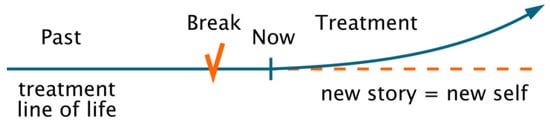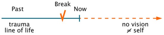 As described, from a philosophical point of view, “[t]he narrative of a life can be one with multiple subplots, digressions, and deviations from the main narrative stream; it need not be linear in a simple-minded way” []. Therefore, in cases when unexpected events occur, the unity of human life [] can be seen as broken []. The most severe conditions of broken self-narrative result from traumatic events (Figure 2), inducing, among other issues, a lack of future vision, distorted views of reality, and problems with self-identification. As memories are emotionally charged, they become substantial parts of the life story that someone uses to constitute their self.