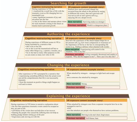 Changing self-image from weak and helpless to that of a survivor is the first step. The second step includes avoidance of negative thought patterns that hinder letting go and moving on, such as self-blame, and turning them into a realization that one has done one’s best in the given situation; and also, that that blame, whether it is self-blame or the blame of others, does not help in the healing process. Next is authoring the experience; realizing that one has done so many other things that were positive and growing experiences will promote wholeness of view toward life and release from the traumatic event. Searching for growth will conclude the process by provoking a survivalist stance toward life’s adversities. Through this procedure, one can take control of one’s narrative about the past and develop healthier meanings to integrate into the overall life story. Moreover, through the VR experience, one may be able to construct a new self-narrative and restore a healthy vision of the future self.