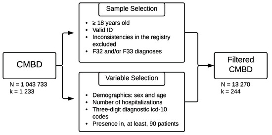 We extracted and preprocessed a sample of N = 13,270 depression-diagnosed patients from the aggregate CMBD databases from 2016 and 2017 [22]. Figure 1 shows the selection process for the sample and variables.