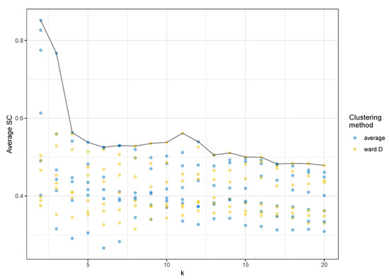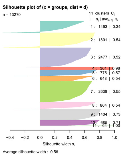 Focusing then on models with a number of clusters greater than three, we found that the one with the highest average silhouette coefficient value (SC = 0.561) was composed of 11 clusters and had been calculated with Ward’s algorithm for agglomerative hierarchical clustering (Figure 4).