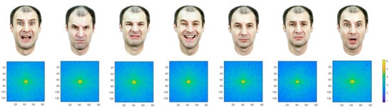 Stimuli images presented intrasaccadically along with their respective Fourier transforms. Left to right, top row: fear, anger, disgust, happy (joy), neutral, sadness, surprise. All images were presented on a 75% gray background.