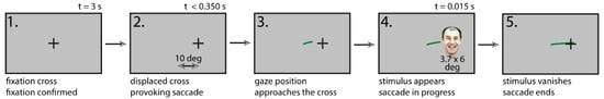 In the beginning of each trial, the participant fixed their gaze on a black cross (spanning square 0.95°) in the center of the screen. After a three-second interval, the cross was replaced by a laterally displaced object, which by experimental design should have initiated a saccade. The very same black cross was used for this purpose. It was shown randomly either to the left or right off the center of the screen at a distance of 10°. After approximately 2 degrees passed by the eye from the saccade’s onset, the test object was displayed (photo of the face). The target image was displayed in one of the following positions: center of the screen (0° displacement), the middle between the center of the screen and the laterally displaced cross (±5°), or right on top of the cross (±10°) (see Figure 2).