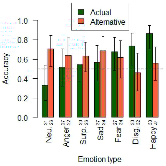 Accuracy bar plot by actual stimulus/alternative choice. Numbers beneath the bars indicate absolute frequencies of each condition in the sample. Vertical bars indicate 95% confidence intervals. Baseline is 0.5.