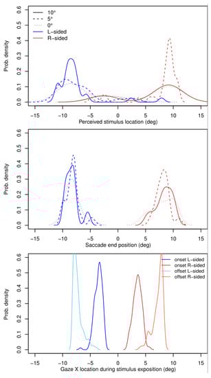 Probability density functions. (Top) Stimulus location as reported by naïve subjects. (Middle) Saccade endpoints. (Bottom) Gaze position at the moment of stimulus onset and offset. Each PDF is split by experimental condition and saccade direction. Deg = degrees.