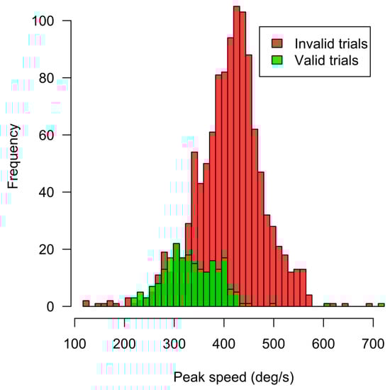 Saccade peak speed histograms in this study both for valid and filtered out trials.
