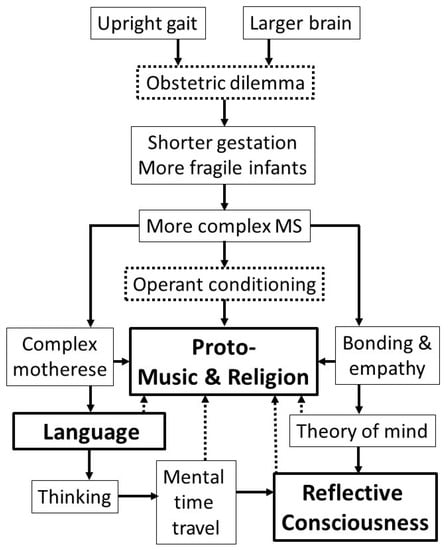 The arrows illustrate hypothetical cause-effect relationships. The main arrows point downward. They reflect the following assumptions: plausible arguments for origins of human behaviors must be non-circular, linking them causally to pre-human phenomena; the main behavioral phenomena of interest here (religion, music, language, reflective consciousness) might not exist without the causal relationships illustrated by the downward arrows. Of the four main phenomena under consideration, reflective consciousness has a special status, because it is not directly observable []; experts are therefore more likely to disagree about the processes that enabled its emergence (the lower right part of the diagram).