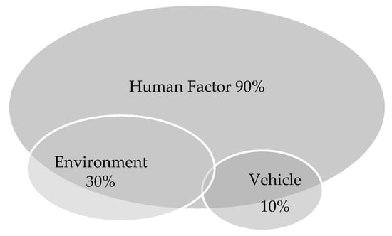 An analysis of research on the topic shows that about 30% of emerging road accidents are due to environmental factors (slippery roads, poor visibility, weather conditions, etc.) and another 10% of road accidents are related to vehicles (flat tires, bad maintenance, etc.). It is also known that the human factor contributes significantly to 90–95% of road accidents [].