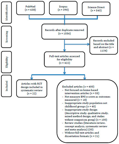 We extracted three databases to screen and select articles based on the PRISMA flowchart and found 1556 documents had been published from 2009 to 2018. The researchers verified relevant articles related to home-based interventions to treat and prevent childhood obesity based on the titles and abstracts of the selected articles. Thereby, 1134 articles were excluded due to inconsistent inclusion criteria.