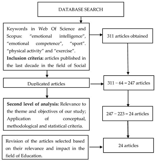 In this way the population of the present study could be fixed. The search was then refined by considering only the articles published in the research domain “Social Science” and having as a priority the research areas “Sport Sciences” and “Education Educational Research”. In order to select the study sample, the following inclusion criteria were used to identify the relevant articles: studies of an empirical nature; EI had been evaluated in the context of physical or sporting activity and research showing statistical results. Papers such as doctoral theses and communications or articles with only published abstracts were therefore excluded. Before applying the inclusion criteria, we deleted 64 articles due to duplication.