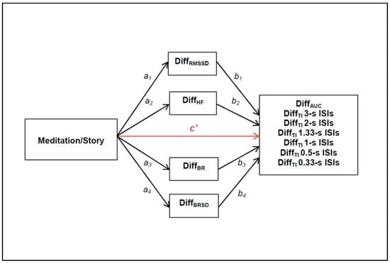 Figure 1. Illustration of the multiple-mediation model applied here. The possible associations between the type of intervention (X: meditation vs. story) and the psychophysical variables (Y: DiffAUC, DiffTI 3 s ISI, DiffTI 2 s ISI, DiffTI 1.33 s ISI, DiffTI 1 s ISI, DiffTI 0.5 s ISI, DiffTI 0.33 s ISI), either directly (c’ path in red color) or through the physiological mediating variables (aibi paths; DiffRMSSD, DiffHF, DiffBR, DiffBRSD), are pictured with arrows.